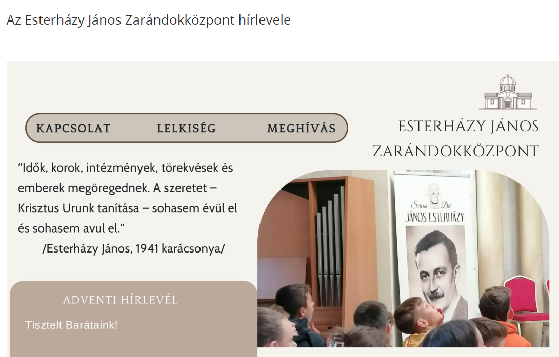 A hónap idézete Esterházy Jánostól: „A segítő készség, munka, áldozat és szolidaritás megerősíti szíveinket felemeli azokat, akik nálunk többet szenvedtek és közelebb hoz egymáshoz minden jóakaratú embert!” (Magyar Hírlap )