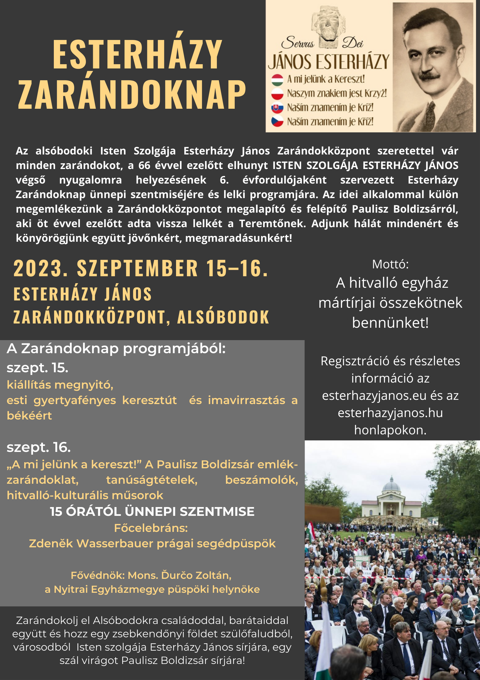 "Isten szolgája Esterházy János boldoggá avatási ügye győzni fog. És ehhez tartozóan lesz kiengesztelődés és egymásra találás a Kárpát-medencei népek közt. Szeptember 17-én megint megmutattuk hamvai nyughelyén, hogy magyarok, szlovákok, lengyelek ezen a keresztúton járunk. Az út és a cél elválaszthatatlanul egy. A dátum csak hitünk függvénye. Az út helyett a keresztút szót azért használtam, mert nem diadalmenet az egymásra találás. Hajrá, tovább! "