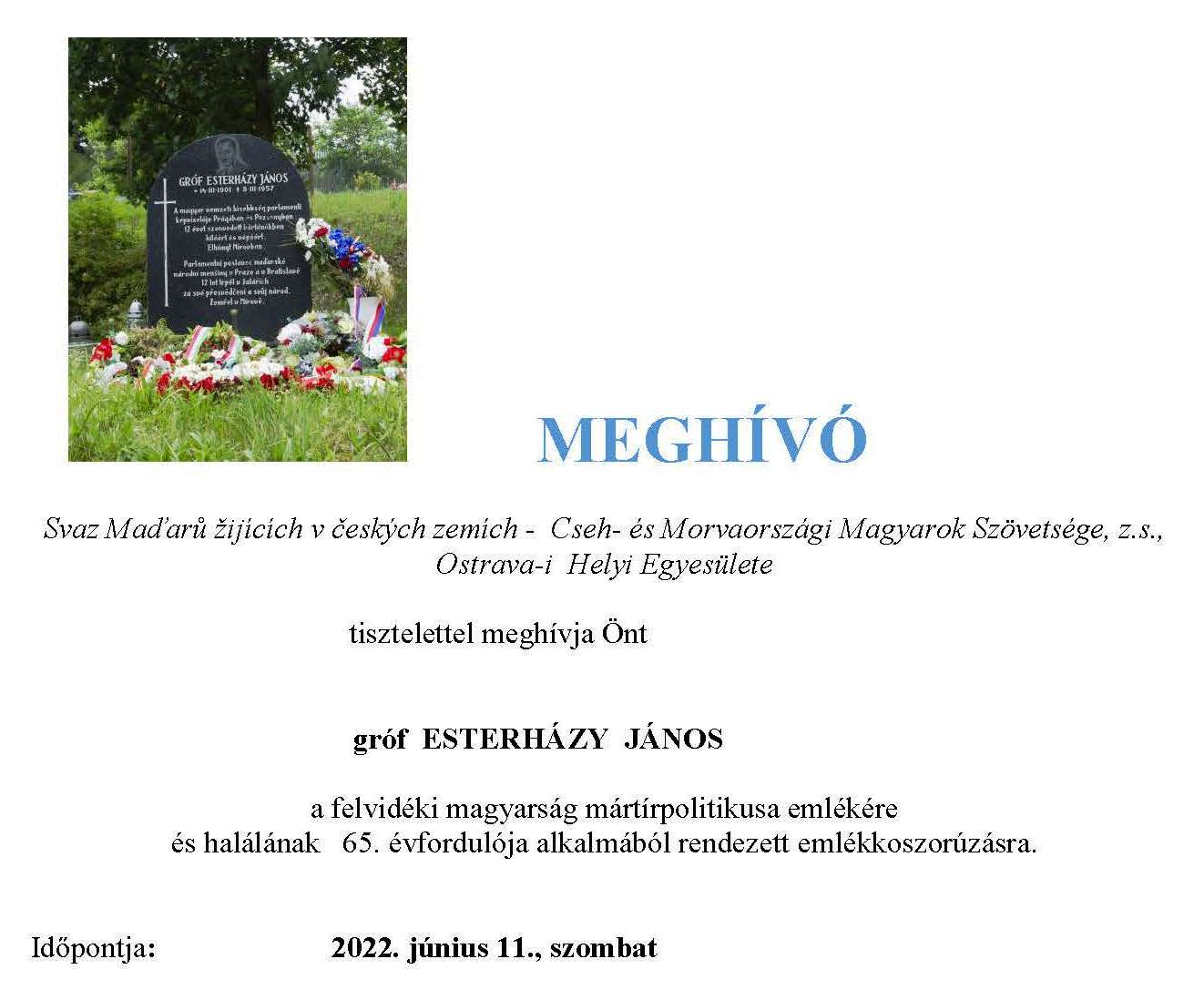Március 22-én, Motolba érkezve a temetőben egy domboldalon felkaptatva találjuk a Kommunizmus áldozatainak emlékművét, ahol számos emléktábla őrzi azoknak a nevét és emlékét, akik a diktatúra áldozataiként itt leltek örök nyugalomra. Külön emléktábla irányítja a figyelmet Esterházy Jánosra. Az emlékező gyülekezet érzülete mélyen megindító, hiszen a hívő emberek tiszteletével fordulnak felé. Magukénak érzik személyét, mert Prágában élt mint parlamenti képviselő, csehországi börtönökben is szenvedett, és ezen a helyen helyezték egy közös sírba a földi maradványait. Az idei alkalom a halálának immár 68. évfordulója volt, s mint megtudtuk, a prágai magyarság minden évben ebből az alkalomból és ezen a helyen gyűlik össze a legnagyobb számban.